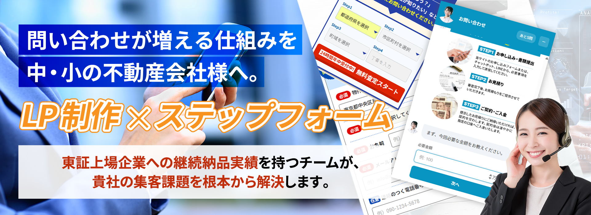不動産買取メディアでの複数LP制作実績を持つデザイナーチームが、貴社の強みと課題をヒアリングし「成果が出るLP」を制作。そこに、問い合わせ完了率を高めるチャット形式のステップフォーム実装と、広告運用・データ分析による継続的な改善提案をプラスします。「見つけてもらい、問い合わせてもらい、成約につなげる」までの導線をプロの視点で構築します。