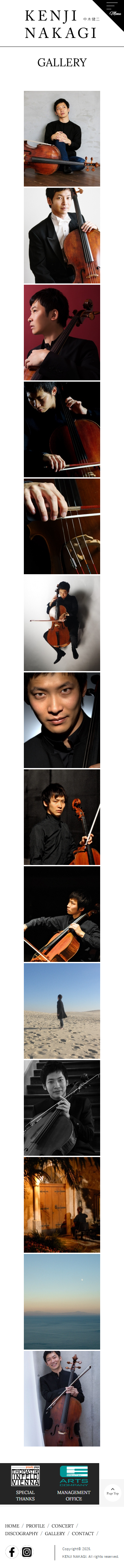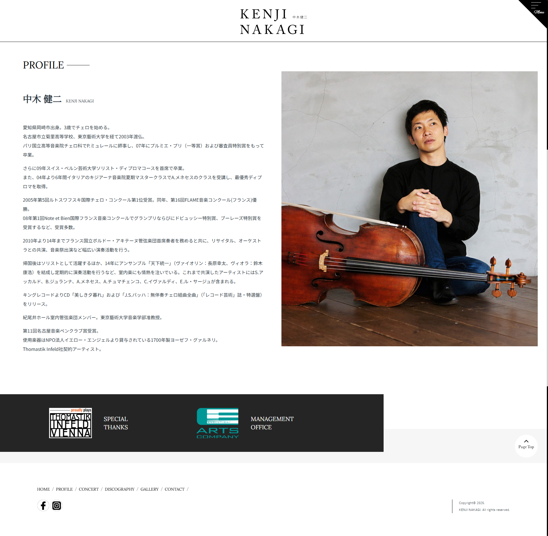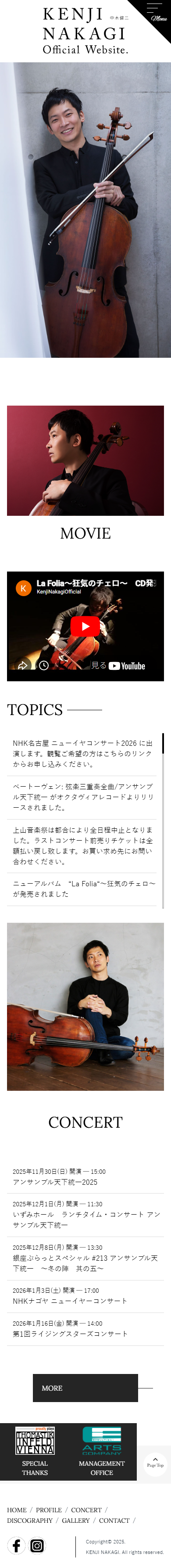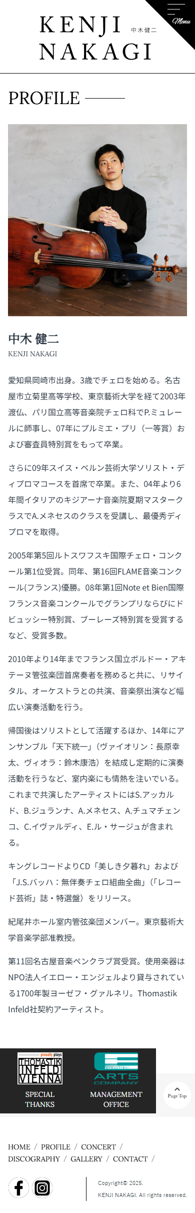- スイス・ベルン芸術大学ソリスト・ディプロマコースを首席で卒業。また、04年より6年間イタリアのキジアーナ音楽院夏期マスタークラスでA.メネセスのクラスを受講し、最優秀ディプロマを取得。2005年第5回ルトスワフスキ国際チェロ・コンクール第1位受賞。同年、第16回FLAME音楽コンクール(フランス)優勝。08年第1回Note et Bien国際フランス音楽コンクールでグランプリならびにドビュッシー特別賞、ブーレーズ特別賞を受賞するなど、受賞多数。2010年より14年までフランス国立ボルドー・アキテーヌ管弦楽団首席奏者を務めると共に、リサイタル、オーケストラとの共演、音楽祭出演など幅広い演奏活動を行い、世界的な人気を誇る、チェリスト、東京藝術大学音楽学部准教授の中木健二様の公式サイトを制作させていただきました。