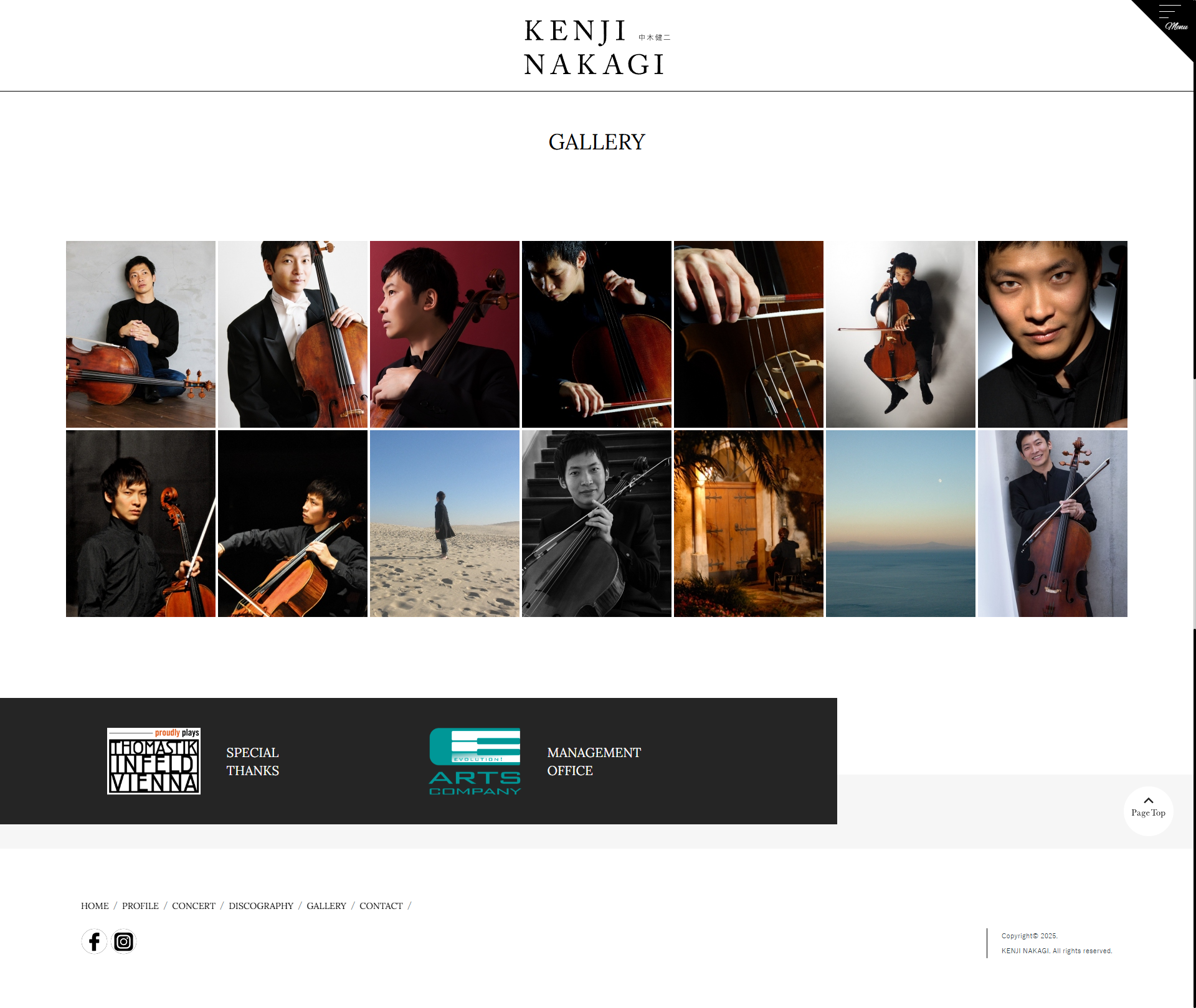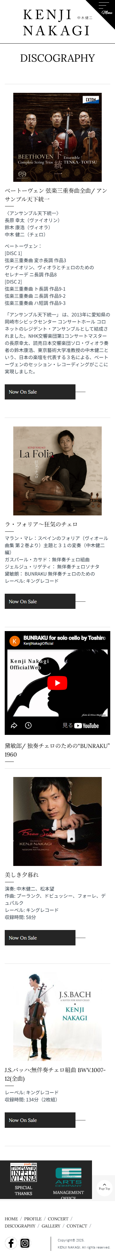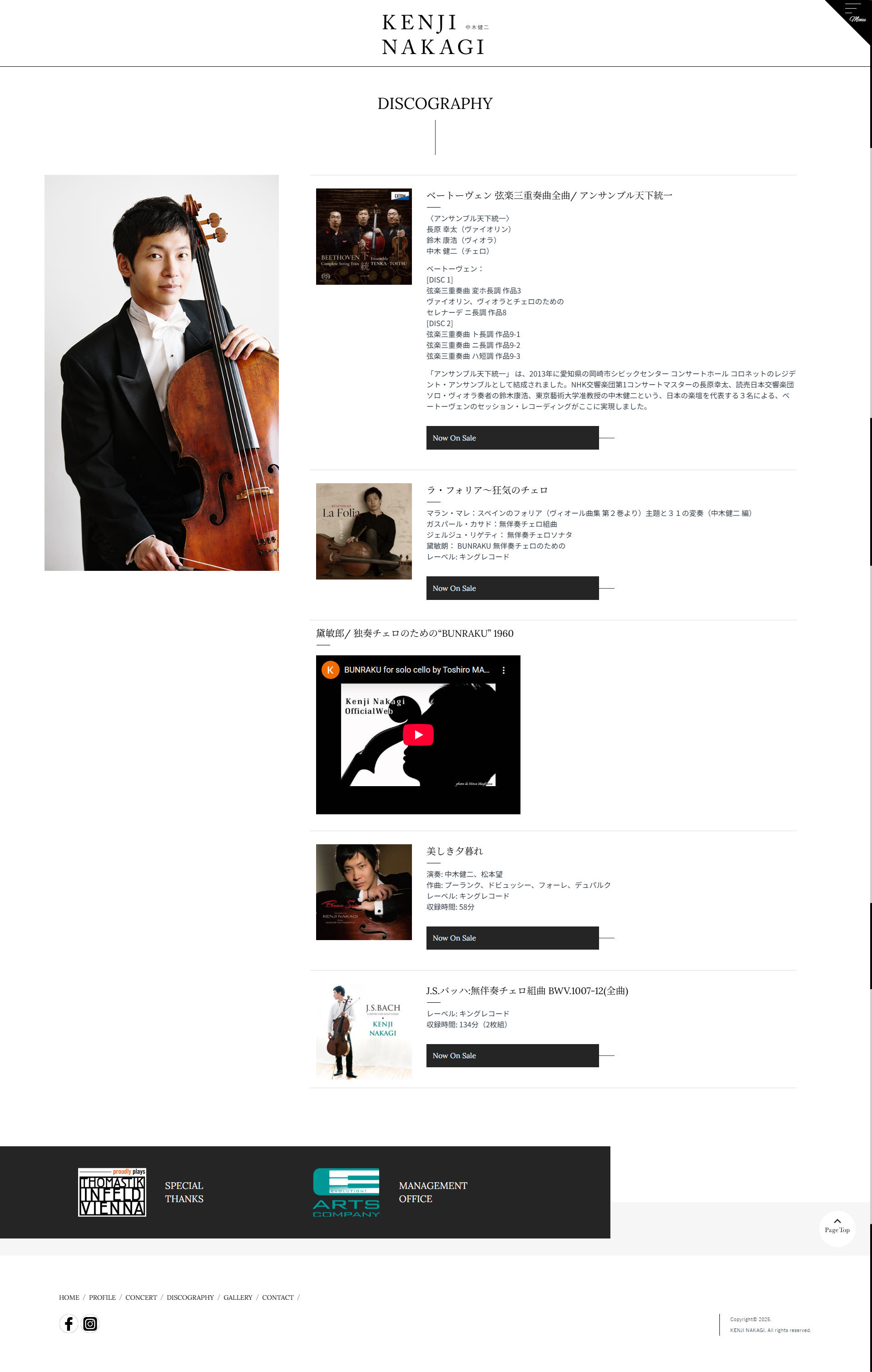 - スイス・ベルン芸術大学ソリスト・ディプロマコースを首席で卒業。また、04年より6年間イタリアのキジアーナ音楽院夏期マスタークラスでA.メネセスのクラスを受講し、最優秀ディプロマを取得。2005年第5回ルトスワフスキ国際チェロ・コンクール第1位受賞。同年、第16回FLAME音楽コンクール(フランス)優勝。08年第1回Note et Bien国際フランス音楽コンクールでグランプリならびにドビュッシー特別賞、ブーレーズ特別賞を受賞するなど、受賞多数。2010年より14年までフランス国立ボルドー・アキテーヌ管弦楽団首席奏者を務めると共に、リサイタル、オーケストラとの共演、音楽祭出演など幅広い演奏活動を行い、世界的な人気を誇る、チェリスト、東京藝術大学音楽学部准教授の中木健二様の公式サイトを制作させていただきました。