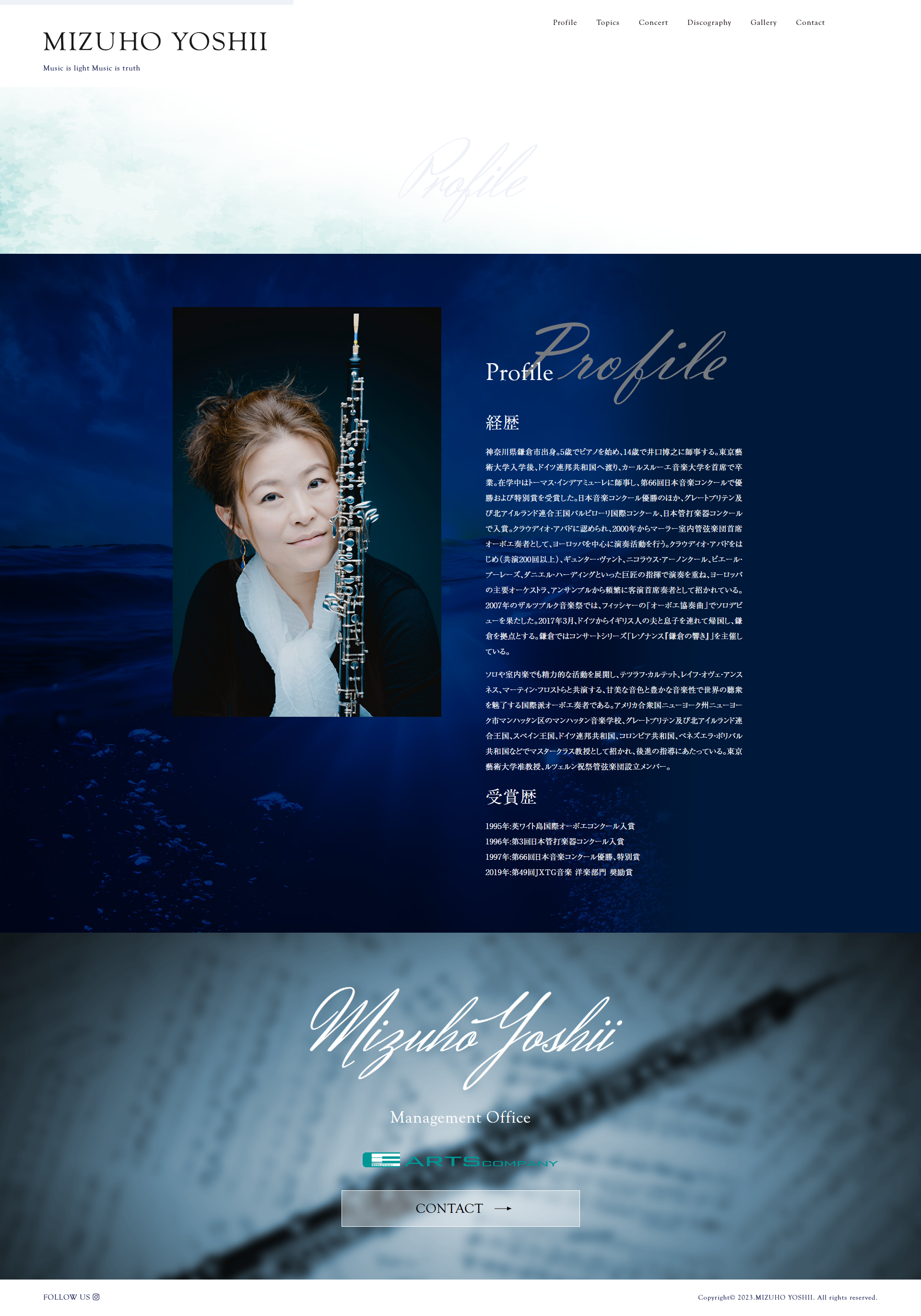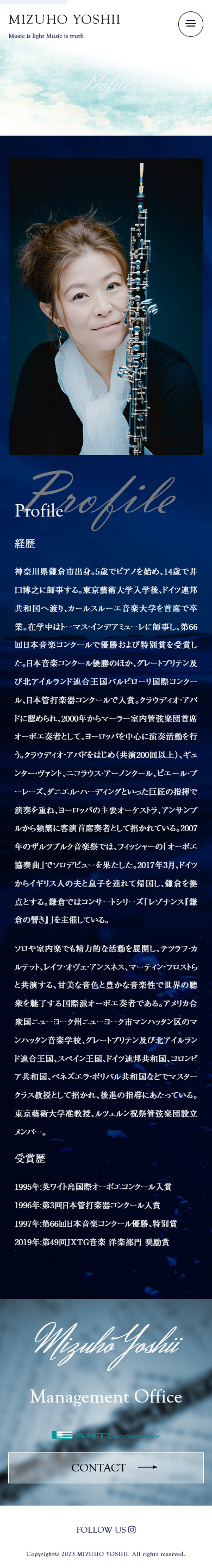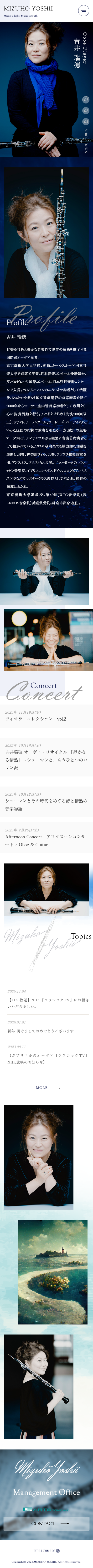 - 東京藝術大学入学後、渡独。カールスルーエ国立音楽大学を首席で卒業。日本音楽コンクール優勝ほか、英バルビローリ国際コンクール、日本管打楽器コンクールで入賞。ベルリン・フィルのエキストラ奏者として活躍後、シュトゥットガルト国立歌劇場管の首席奏者を経て2000年からマーラー室内管首席奏者として欧州を中心に演奏活動を行い、ニューヨークのマンハッタン音楽院、イギリス、スペイン、ドイツ、コロンビア、ベネズエラなどでマスタークラス教授等を歴任。東京藝術大学准教授。第49回JXTG音楽賞(現ENEOS音楽賞)奨励賞受賞した吉井瑞穂様の公式ウェブサイトをさせていただきました。