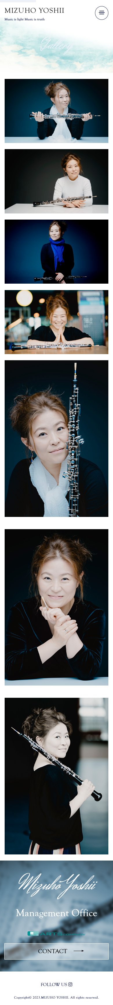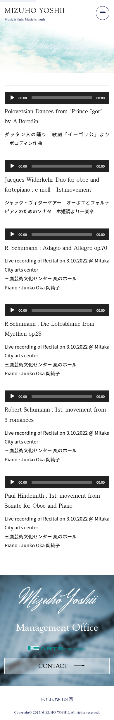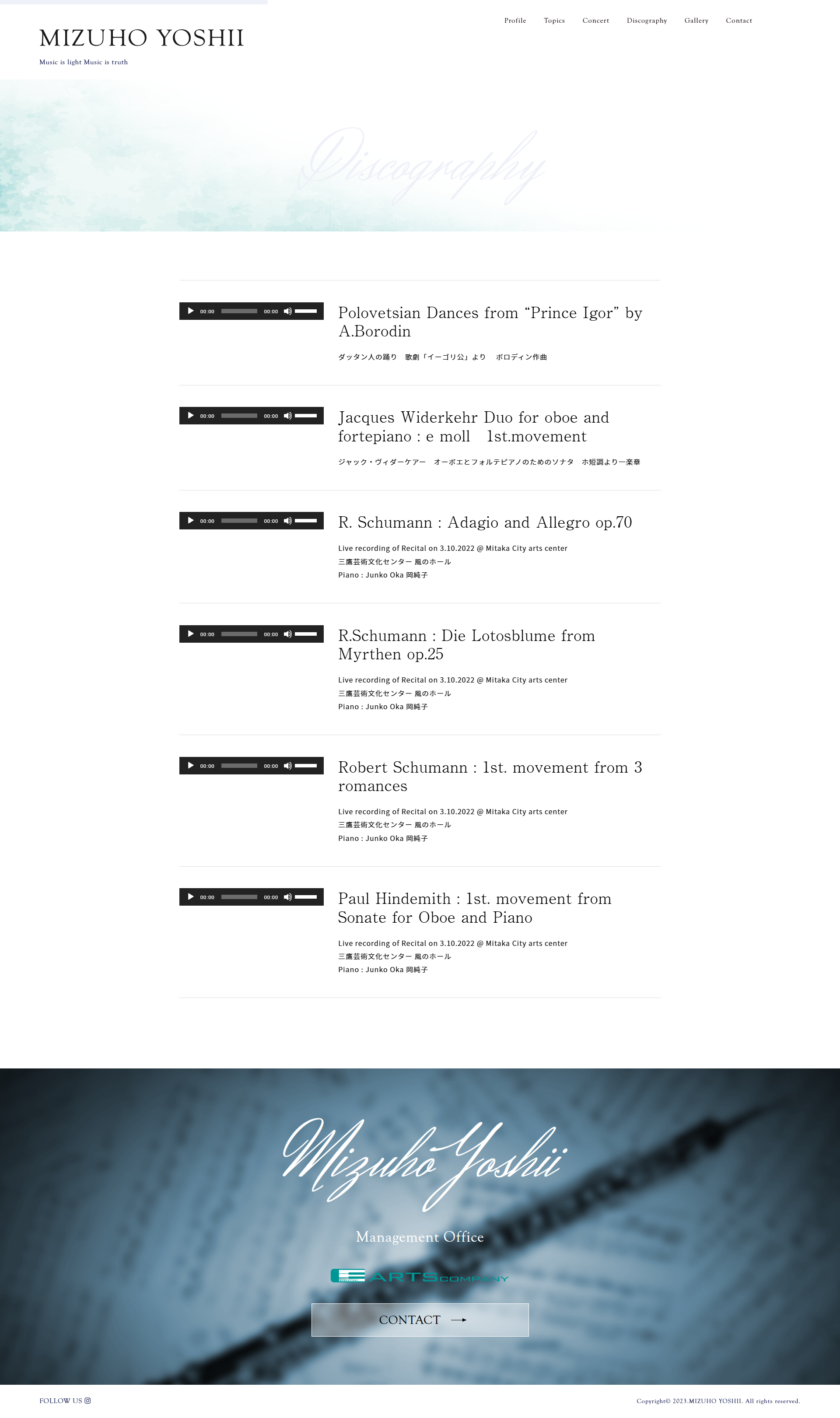 - 東京藝術大学入学後、渡独。カールスルーエ国立音楽大学を首席で卒業。日本音楽コンクール優勝ほか、英バルビローリ国際コンクール、日本管打楽器コンクールで入賞。ベルリン・フィルのエキストラ奏者として活躍後、シュトゥットガルト国立歌劇場管の首席奏者を経て2000年からマーラー室内管首席奏者として欧州を中心に演奏活動を行い、ニューヨークのマンハッタン音楽院、イギリス、スペイン、ドイツ、コロンビア、ベネズエラなどでマスタークラス教授等を歴任。東京藝術大学准教授。第49回JXTG音楽賞(現ENEOS音楽賞)奨励賞受賞した吉井瑞穂様の公式ウェブサイトをさせていただきました。