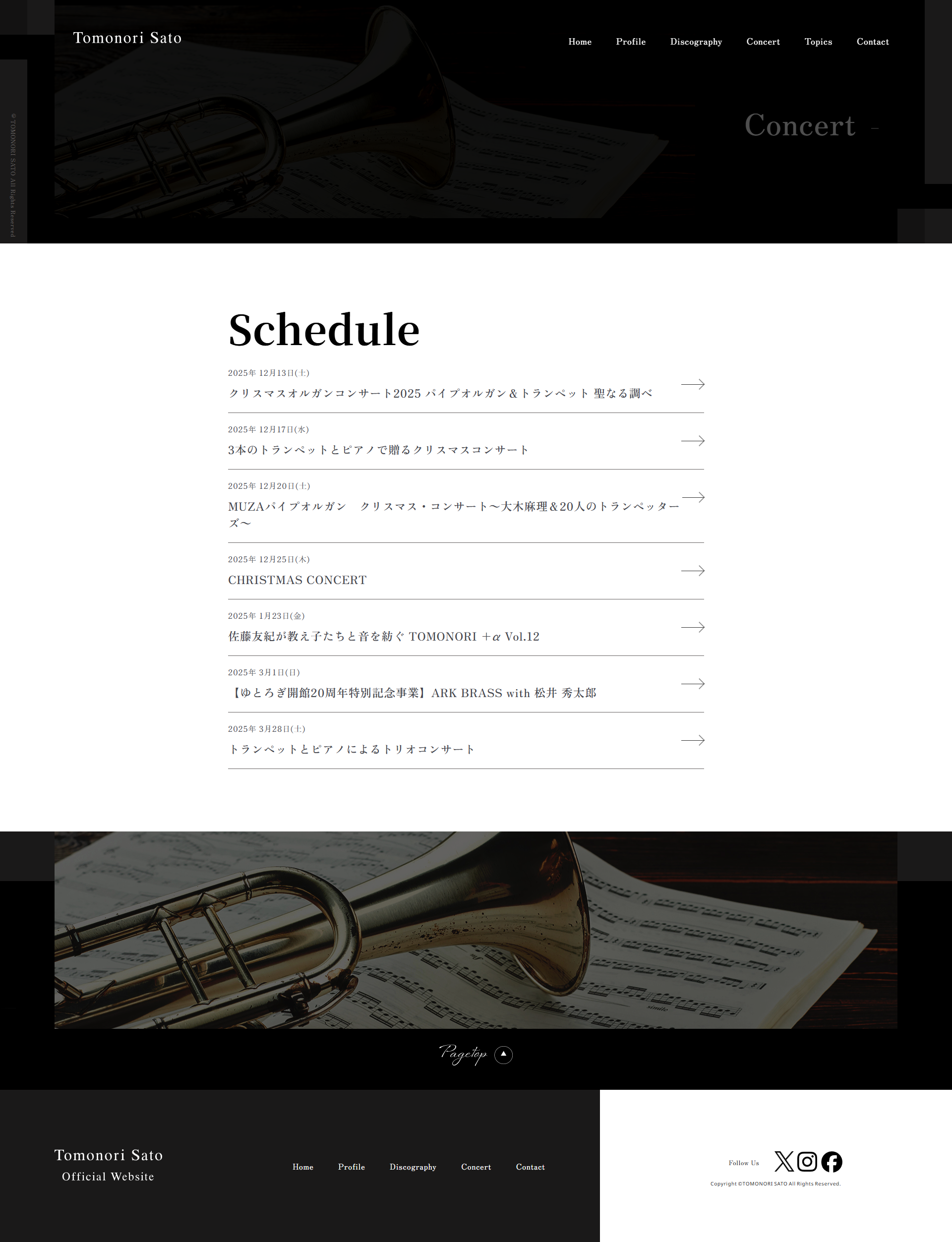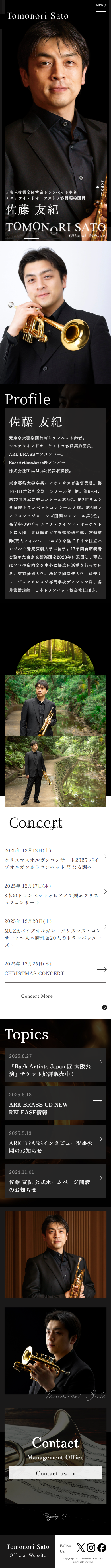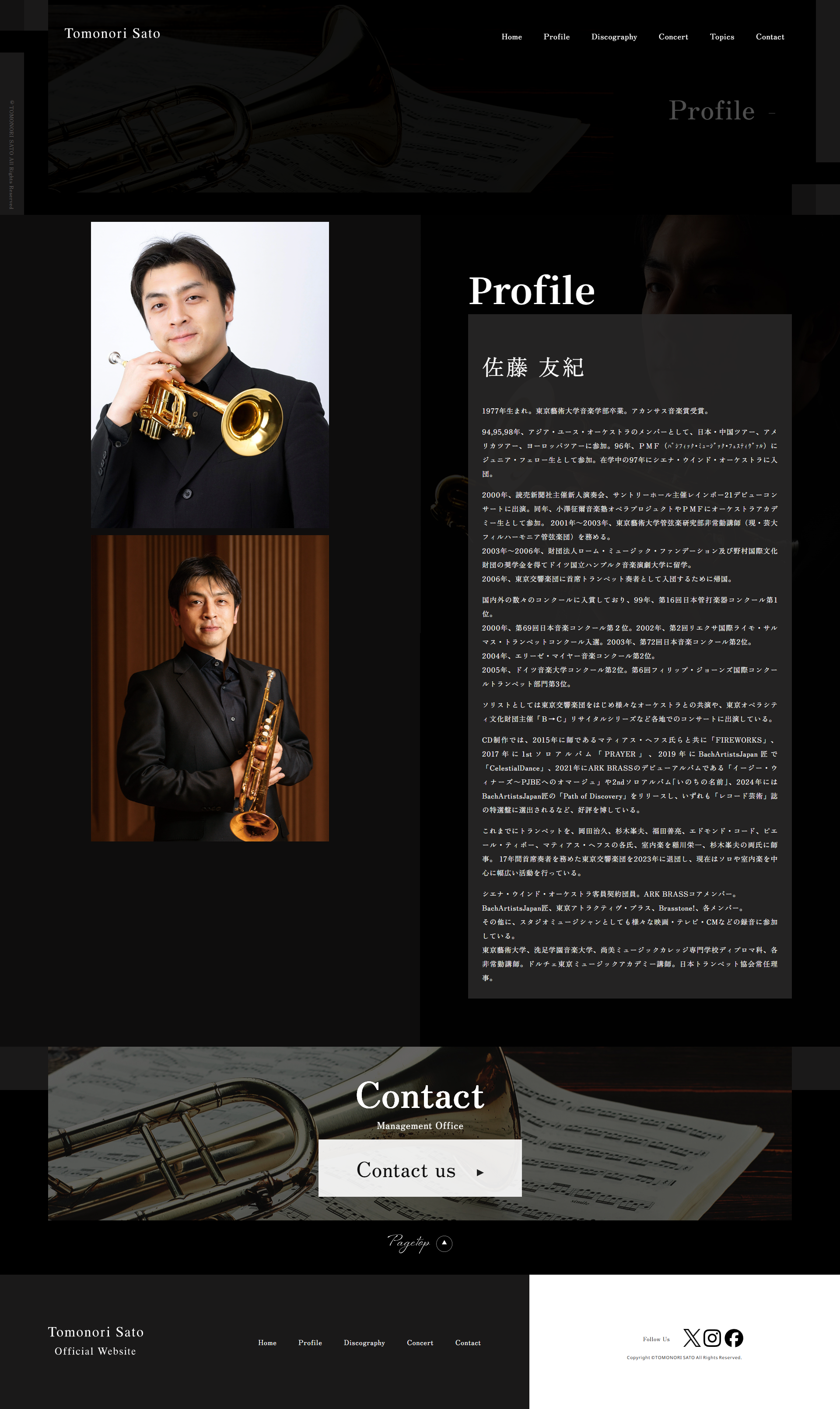 第16回日本管打楽器コンクール第1位をはじめ数々の世界的な音楽賞を受賞し、東京藝術大学、洗足学園音楽大学、尚美ミュージックカレッジ専門学校ディプロマ科各非常勤講師として、数多くのトランペット奏者の育成を行っている、トランペット奏者/ブロウミュージック代表の佐藤友紀様のオフィシャルサイトを制作させていただきました。