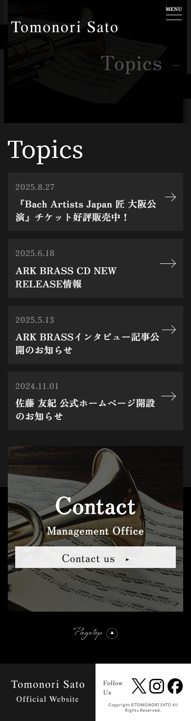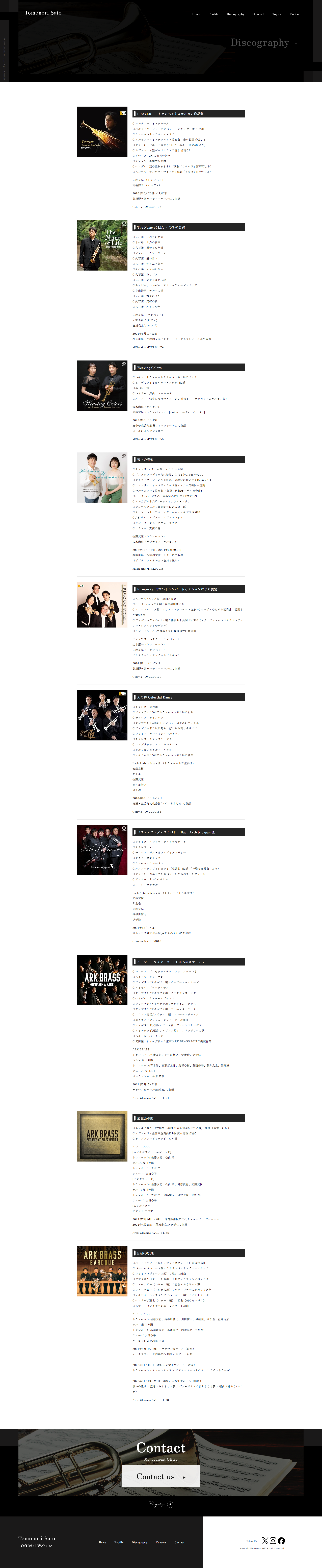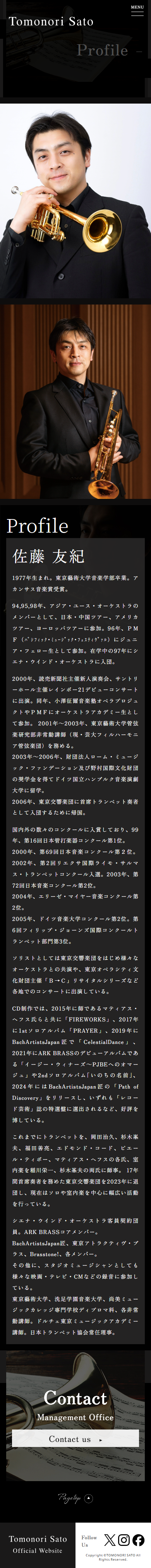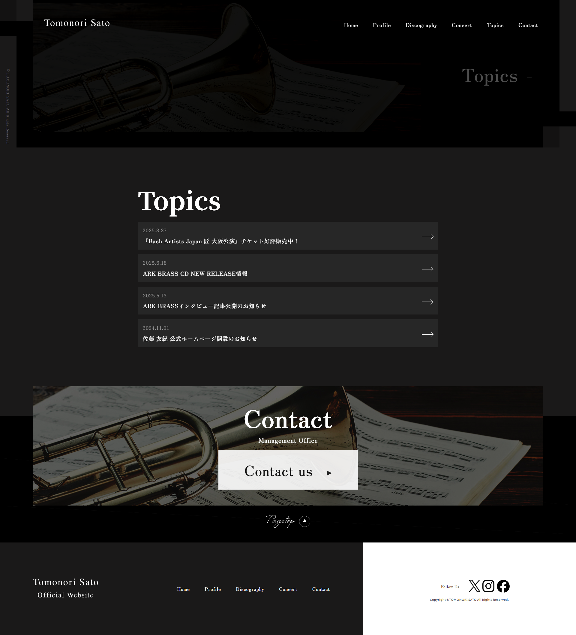 第16回日本管打楽器コンクール第1位をはじめ数々の世界的な音楽賞を受賞し、東京藝術大学、洗足学園音楽大学、尚美ミュージックカレッジ専門学校ディプロマ科各非常勤講師として、数多くのトランペット奏者の育成を行っている、トランペット奏者/ブロウミュージック代表の佐藤友紀様のオフィシャルサイトを制作させていただきました。